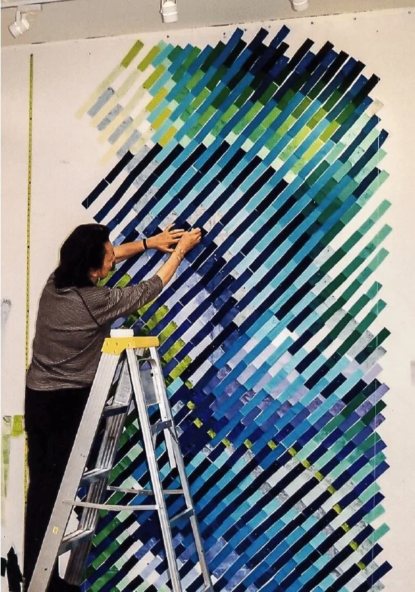 Watching her create pieces on the wall, using strips of solid colored fabrics, it seems as though she stands with brush and paint palette.